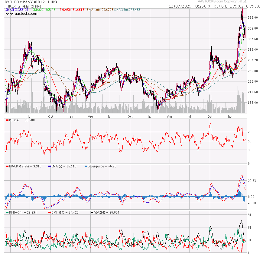 חברת BYD הנסחרת בהונג קונג הינה יצרנית הרכב האלקטרוניקה והסוללות BYD שבניידים. הרווח הנקי של BYD, המהווה כ -8% בבעלות ברקשייר האת"ווי של וורן באפט. החברה עוסקת בייצור ומכירה של ציוד תחבורה, רכבים ואוטובוסים. החברה עוסקת גם בייצור ומכירה של חלקים אלקטרוניים ורכיבים אלקטרוניים ואלקטרוניקה לשימוש יומיומי. מוצרי החברה כוללים סוללות נטענות ומוצרים פוטו - וולטאיים, חלקי טלפון נייד והרכבה, תאורת LED, ומכוניות ומוצרים נלווים. במחצית הראשונה של השנה, כאשר החברה נהנתה מתמריצים ממשלתיים לצרכנים לרכישת כלי רכב חדשים וחשמליים ומלגזות. המכירות של 9 דגמים כלי רכב ידידותיים לסביבה גדל פי 1.6 ל 15 מיליארד יואן, זה עזר להגדיל את המחזור הכולל של החברה ל -43.7 מיליארד יואן. תשעה חודשים הרווח לתקופה עד ספטמבר צפוי לגדול עד 91% לעומת שנה קודמת, החברה בראשות המיליארדר וואנג צ"אנג-פו, נהנית משנים של מאמץ באנרגיה המתחדשת כך שהחברה מייצרת גם אוטובוסים חשמליים.