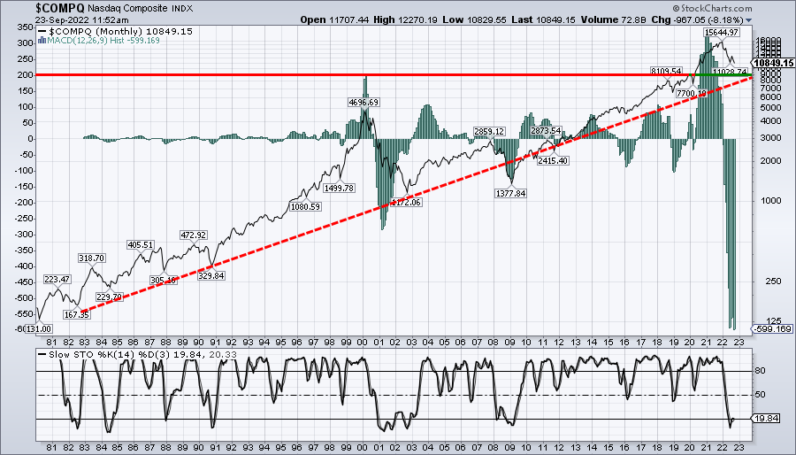 לפנינו גרף נסדא"ק על פני כ-40 שנה. ובו מתנדים שונים. המתנד העליון מתנד ה-MACD המראה את התנועה הלונגית כעת של הגרף. מתחתיו גרף המדד עם נתוני שיא ושפל. מתחת מתנד FORCE שמבטא את נפח התנועה במהלך התקופות.