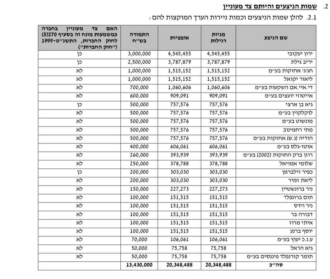 בהנפקה משתתפים 25 משקיעים בהם מספר דמויות בולטות בשוק ההון הישראלי:ירון יעקובי שצפוי להשקיע 3 מיליון שקלים ולעלות להחזקה של כ-11.1%,יריב גילת ששומר על חלקו בהון ומזרים 2.5 מיליון שקלים,האחים חג׳ג׳ שצפויים להשקיע מיליון שקלים,ברק רוזן מבעלי ישראל קנדה שצפוי להשקיע 260 אלף שקלים ועוד דמויות בולטות נוספות.