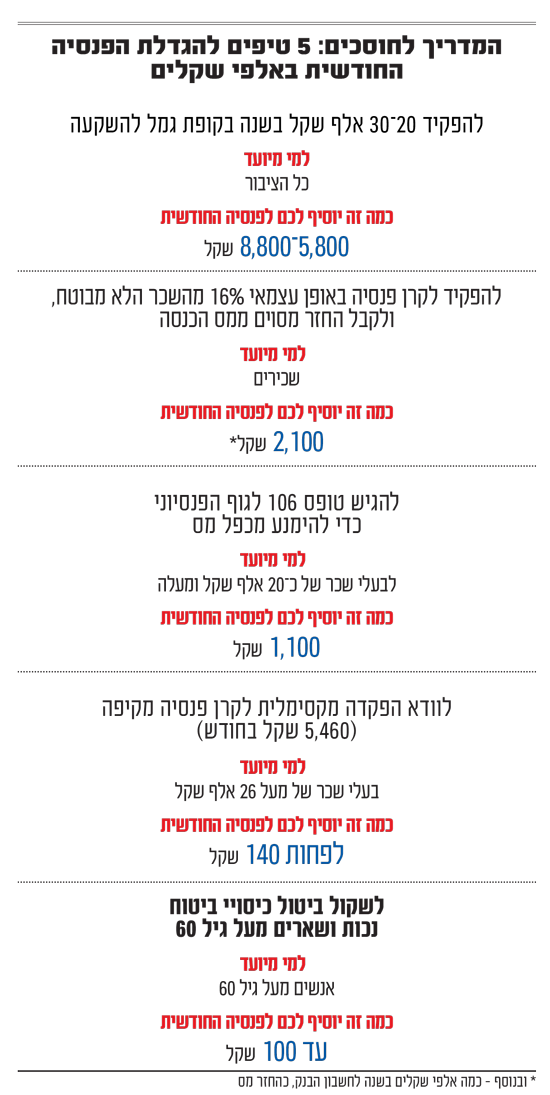 המשמעות היא, לדברי אילה אבני, מנכ"לית סיטרין ייעוץ פנסיוני, שתקבלו תוספת לקצבת הפנסיה החודשית בסך 5,800 שקל. אם תחסכו מדי שנה 30 אלף שקל, הקצבה החודשית תזנק לכ־8,800 שקל בחודש.